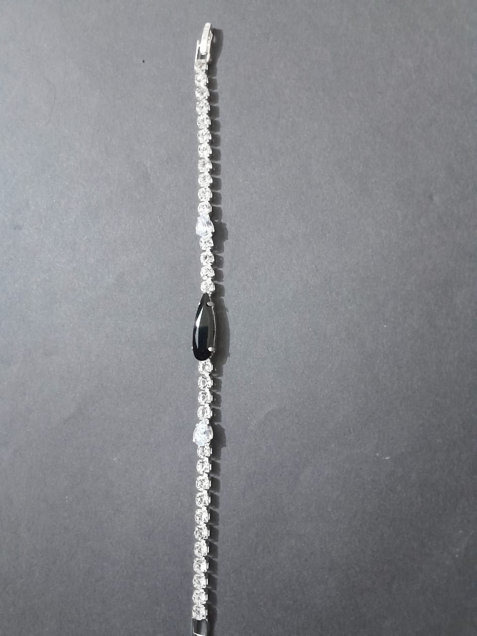 A charming artificial bracelet in a silver, white, and black combo, featuring an oval black stone surrounded by delicate silver beads for a cute, stylish design.