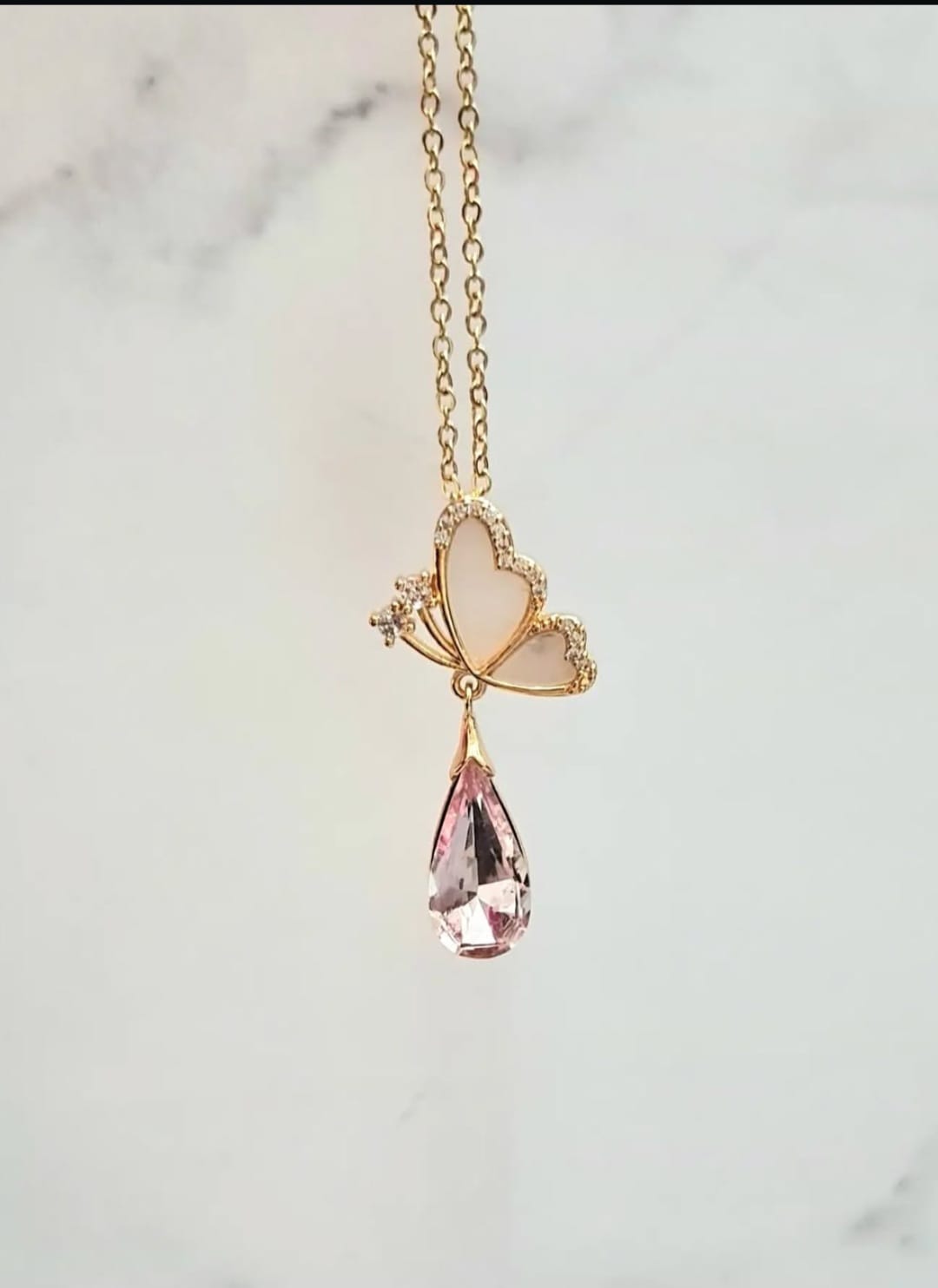 Elevate your elegance with this exquisite necklace featuring delicate golden butterfly wings that shimmer with every move. At the heart of this enchanting design lies a soft pink pendant, adding a touch of romance and charm. Perfect for gifting or adding a graceful statement to your outfit, this necklace blends feminine beauty with timeless sophistication.